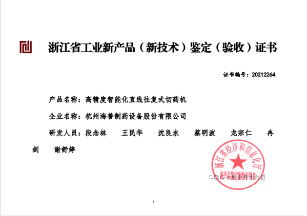 產(chǎn)品一:高精度智能化直線往復(fù)式切藥機(證書編號:20212264)